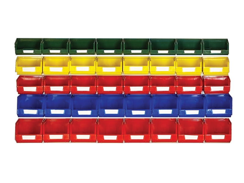 Plastic bin kit. High density polyethylene construction with stackable design. Resistant to most chemicals, oils and grease. Suitable for temperature range -35 to + 80 degrees C. Includes label strip, For use freestanding or with louvre panels. Supplied as a kit of 40 Mixed type.